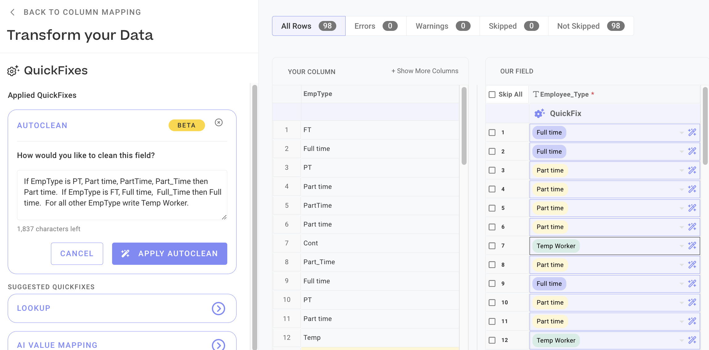 Step 1:  Go to your newly created Uploader and upload your data.   Once the AutoMapping is complete, select the field you wish to initiate the Auto Clean.  In our scenario it is Employee\_Type.&#x20;