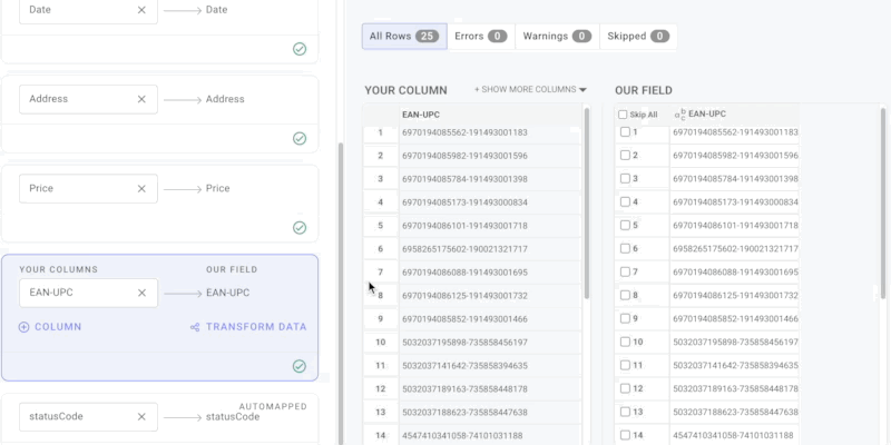 **Note**: If you are uploading a file to clean up (i.e. not using Osmos Pipelines) you can also resolve errors by manually skipping that row using the row level checkboxes, or by providing a single-cell edit by clicking on any cell in the output column and editing the value.