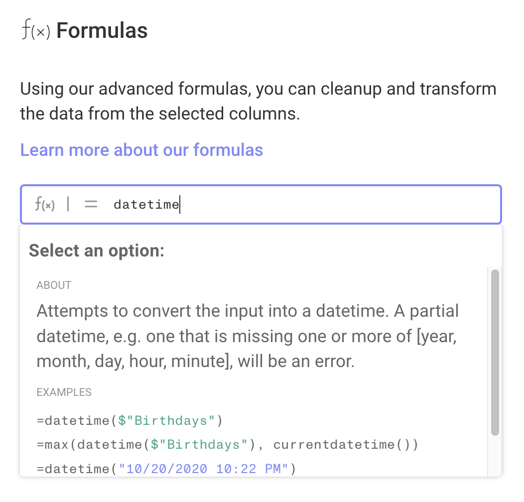 Formulas can be used to complete complex transforms on data from one or more input columns. We have several predefined formulas (such as CONCAT, DATE, ADD, IF, IFERROR, etc.) that can be used together.