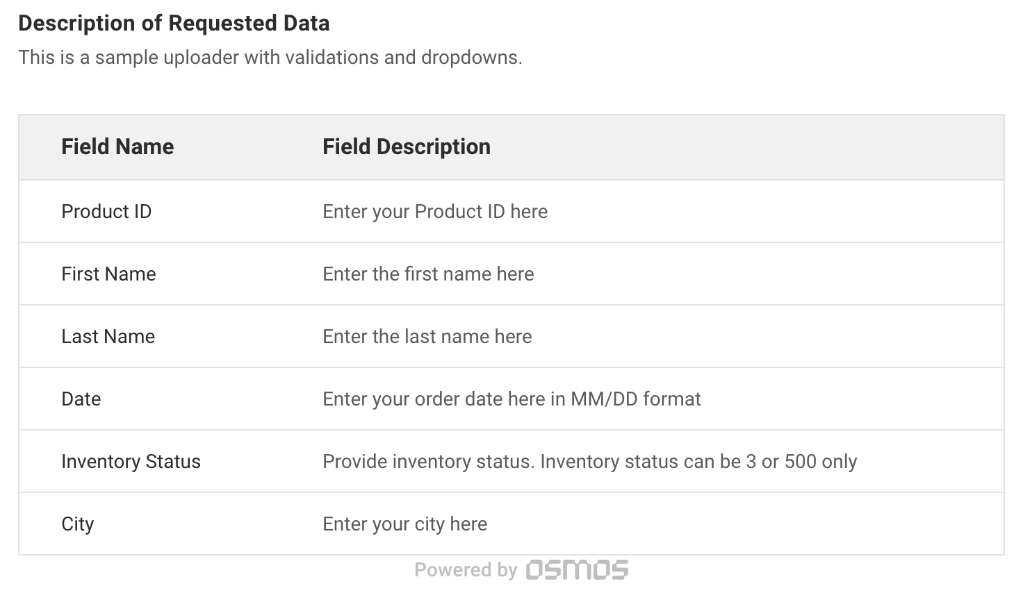 There are a number of additional options that can be modified in the initial osmos.configure function call to customize the uploader further. Below is a configured sample Osmos Uploader with a single field: