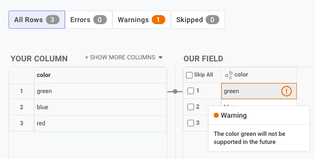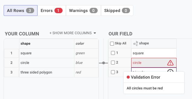 * **Error:** the field is invalid and will be rejected from being written to the destination system.  An error message will be shown during the training process and the user will be blocked from saving the transformation until the error is resolved.  During transformation, the record will be marked as an error and the underlying pipeline/uploader will need to be retrained.