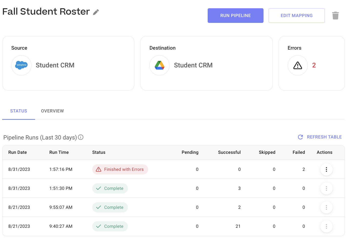 Under the Overview tab, you can view details about the pipeline overall such as date created, total records, schedule, last run and pipeline ID.